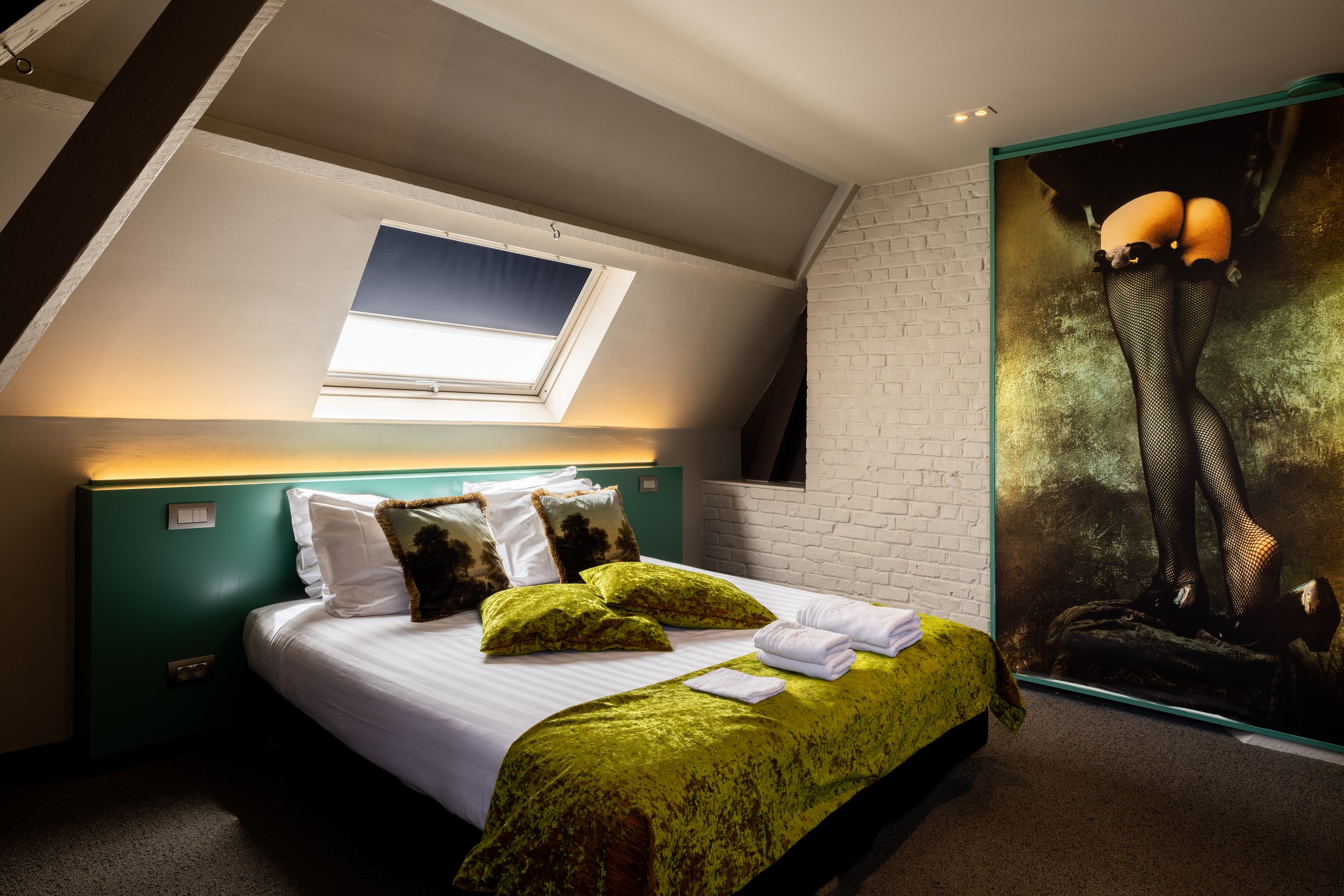 Betreed de weelderige pracht van deze loft, een kamer die de definitie van luxe overstijgt. Deze ruime zolder loft is de mooiste standaardkamer die je ooit zult ervaren, met een aparte badkamer en een sensueel kunstwerk dat de zintuigen prikkelt.